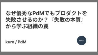 PM関連本 なぜ優秀なPdMでもプロダクトを失敗させるのか?『失敗の本質』から学ぶ組織の罠 この記事の要約 80年前の日本軍の戦略的失敗パターンは、現代のプロダクト開発組織にも共通するものがある 戦略の曖昧性、過去の成功体験への固執、権限と責任の不一致という構造的問題がPdMの悩みの根源 OKR設定、心理的安全性の確保、Two-w... 2025.09.14 PM関連本プロダクト推進