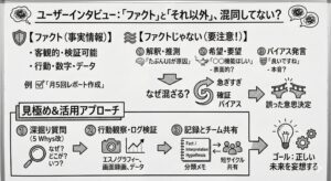 • 優れたPdMは、インタビューメモを「事実・解釈・仮説」の3層に分け、ログデータやエスノグラフィー(行動観察)と突き合わせることで、発言の裏にある真実をあぶり出す。