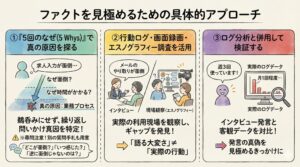 ユーザーインタビューだけでなく、ログ分析や行動データを組み合わせて検証するのも有効です。