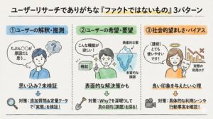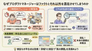 また、PdM自身が「こうあるべき」という仮説を強く持ちすぎている場合も要注意。ユーザーの発言のうち、自分の仮説を裏付けるような部分だけを抜き出してファクト扱いしてしまう“確証バイアス”も、混乱の原因になります。