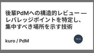 プロダクト企画 後輩PdMへの構造的レビュー — レバレッジポイントを特定し、集中すべき場所を示す技術 この記事の要約 経験の浅いPdMは「どこがレバーか」を見抜けず影響力の小さい施策に時間を浪費してしまう。先輩PdMの役割は問題の構造を可視化し、最大の効果を生むレバレッジポイントを特定して示すこと 構造的レビューとは、PRDを1行ずつ添削す... 2025.10.05 プロダクト企画プロダクト推進