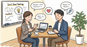 最近配属されたばかりの新人との1on1。まだ信頼関係が浅い。